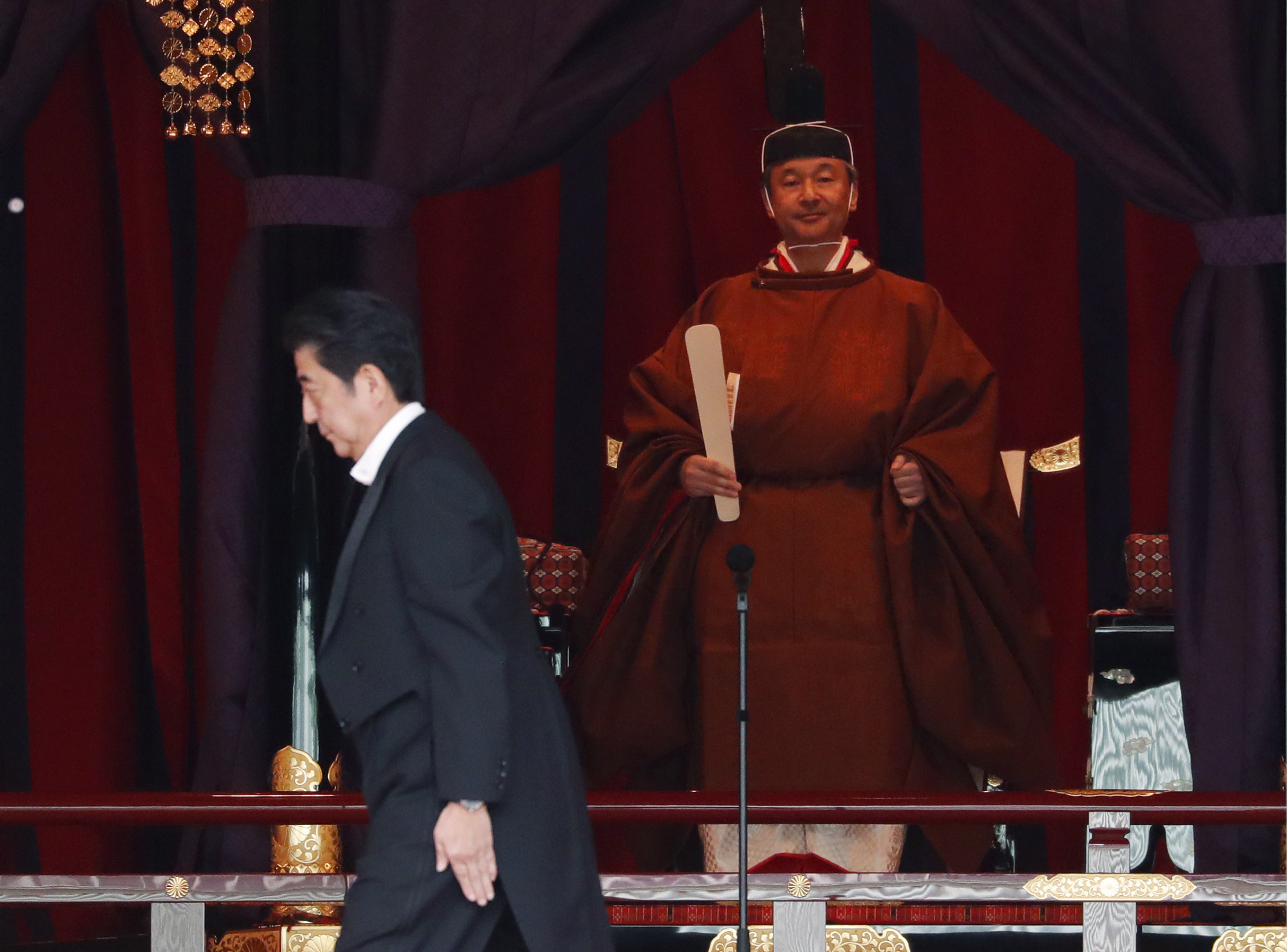 나루히토 일왕은 이날 오후 1시10분쯤 왕궁 내 접견실인 마쓰노마에 놓인 ‘다카미쿠라(高御座)’ 안에서 모습을 드러냈다. 종소리에 함께 보라색 장막이 걷혔다. 헤이안(平安) 시대(794~1184년)부터 이어져왔다는 전통복장인 갈색 ‘고로젠노고호’를 입은 모습이었다. 그 옆 미초다이(御帳台)에선 여성 전통복장인 주니히토에(十二單)를 한 마사코(雅子) 왕비도 등장했다.