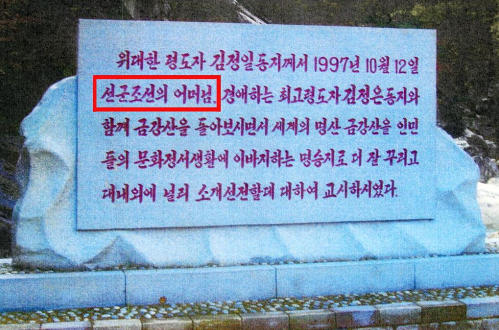 ‘선군’은 김정일 국방위원장의 상징하는 단어다. 산케이는 금강산 관광지 내의 만경교 부근 광장, 받침대와 함께 정비된 이 비석에 대해 일본 정부도 파악하고 있다고 전했다. 산케이는 일본 정부 관계자를 인용해 “(북한에서) 최고지도자의 ‘역사’를 전하는 비석 건립은 조선노동당의 중요 사업”이라며 “김씨 일족의 최고지도자 3대 말고 김일성 주석의 처인 김정숙에 대한 언급이 있었지만, 김 위원장의 생모를 거론한 적은 없다”고 전했다.