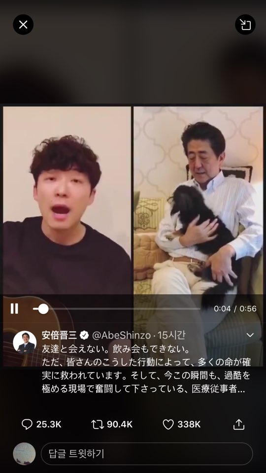 아베 총리는 전날 오전 자신의 트위터 등에 자택에서 반려견과 시간을 보내거나 차를 마시고 독서를 하는 모습 등이 담긴 동영상을 호시노가 ‘집에서 춤추자’는 곡을 기타를 연주하면서 부르는 동영상과 함께 올렸다. 호시노가 지난 3일 “누군가 이 동영상에 악기 반주나 코러스나 춤을 더해주지 않을까”라고 요청한 데 따라 유명인들의 호응이 잇따르는 것을 활용한 셈이다. 아베 총리는 이 동영상과 함께 “친구와 만날 수 없다. 회식도 못 한다. 다만, 여러분의 이런 행동이 많은 목숨을 확실히 구하고 있다”면서 외출 자제에 대한 국민의 이해를 구했다.
