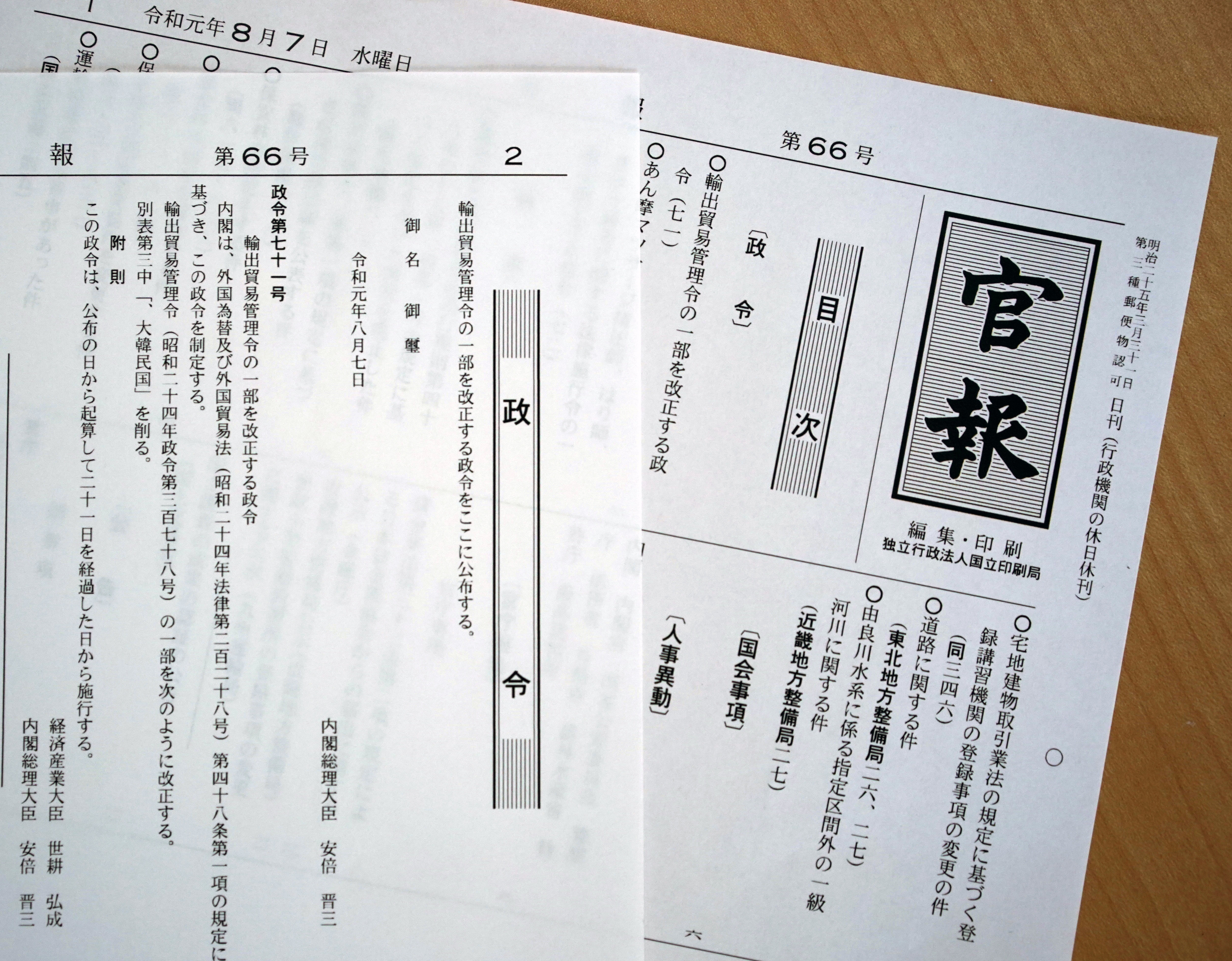 일본 정부는 이날자 관보를 통해 “수출무역관리령 일부를 개정해 한국을 화이트리스트에서 제외한다”면서 “이 관리령은 공포일로부터 21일을 경과한 날부터 시행한다”고 밝혔다. 이에 따라 지난 2일 아베 신조(安倍晋三) 총리가 주재한 각의에서 통과한 개정안은 오는 28일부터 시행된다.