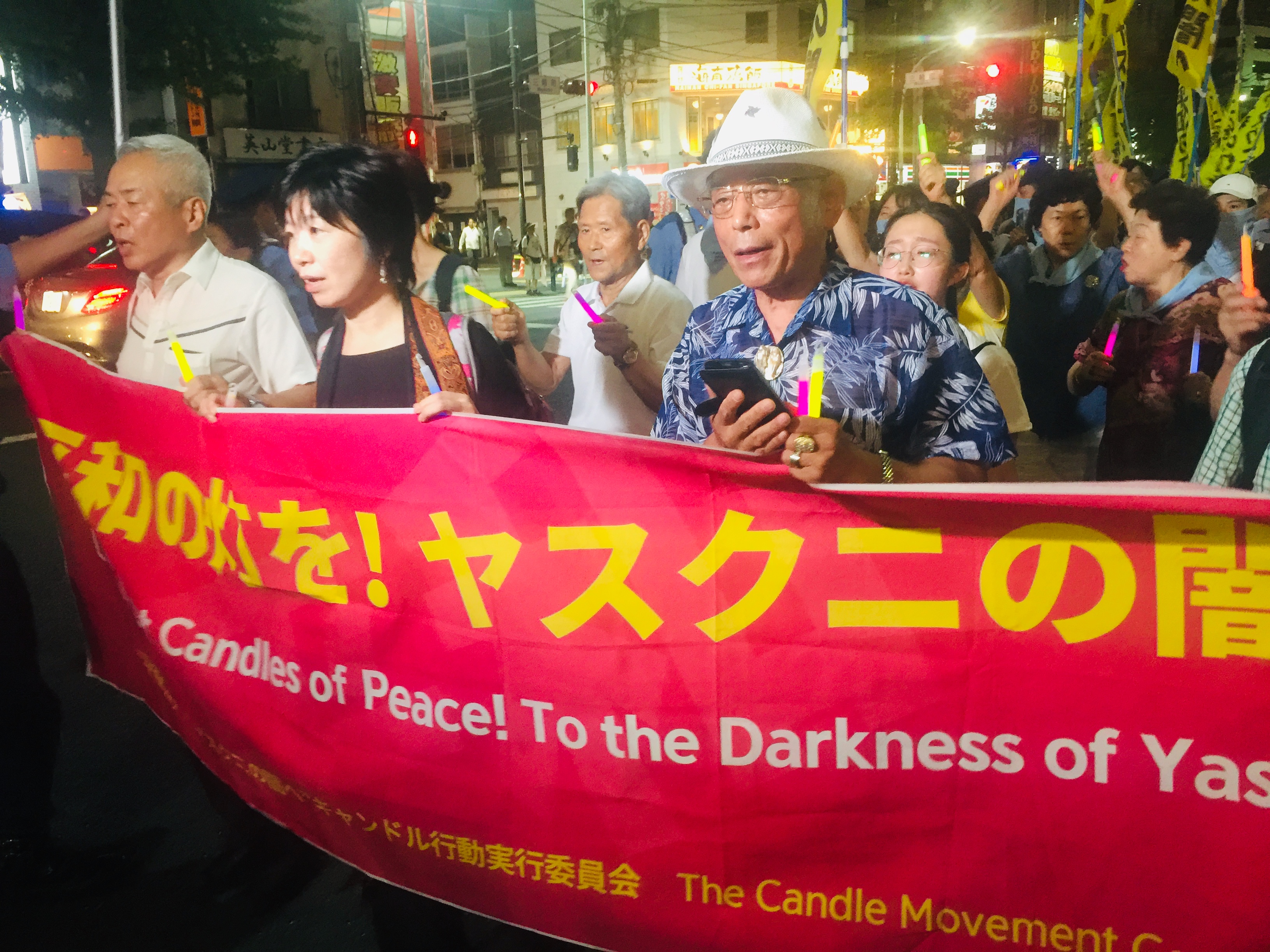 ‘야스쿠니 반대 도쿄 촛불행동’이 주최한 이번 행사는 오후 7시 도쿄 재일 한국YMCA 건물 앞을 출발해 야스쿠니신사에서 700m 정도 떨어진 인근 공원까지 약 1.5㎞ 구간에 걸쳐 40여분 간 진행됐다. 행진 대열 맨 앞에는 ‘평화의 등불을! 야스쿠니의 어둠에’라는 플래카드가 펼쳐졌다. 경찰들이 대열 주변을 둘러싸는 등 삼엄한 경비가 펼쳐졌다. 참가자들은 LED 촛불을 흔들면서 “야스쿠니 노(No)”라는 구호를 함께 외쳤다. “(한국인 희생자들의) 합사(合祀)를 그만둬라”, “아베 반대”, “개헌 반대”, “전쟁 반대” 등의 구호가 잇따랐다.