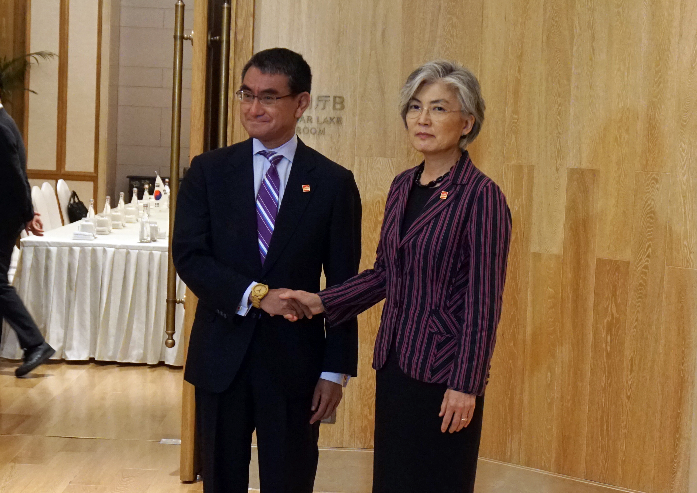 강경화 외교부 장관과 고노 다로(河野太郞) 일본 외무상은 이날 오후 2시쯤(현지시간) 중국 베이징 구베이수이전(古北水鎭)에서 35분간 회담을 가졌다. 강 장관은 일본 정부가 지난 2일 각의(국무회의)에서 한국을 화이트리스트에서 제외한 것에 깊은 유감을 표명하고, 즉각 철회를 강력히 촉구했다. 강 장관은 또 양국의 관련 당국 간 대화가 조속히 성사될 필요성을 강조하고 일본 외무성 등이 가능한 노력을 기울여 줄 것을 요구했다.