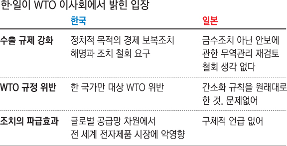 일본의 대(對)한국 수출규제 조치를 두고 한·일이 세계무역기구(WTO)에서 처음 맞부딪쳤다. 한국 측은 이번 조치가 “정치적 목적의 경제 보복”으로 WTO 자유무역 원칙에 어긋난다고 강조한 반면, 일본 측은 “안보상 조치로 문제 없다”는 주장을 반복했다.
